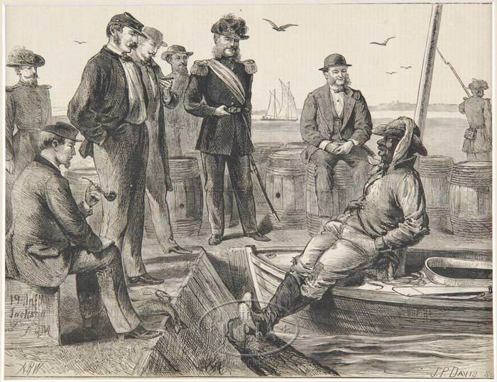 J P DAVIS (American, 19th Century) “ON THE MISSISSIPPI AT FORT JACKSON”. Engraving from a newspaper type publication shows military men surrounding an Afro-American seated in a small sailboat. Signed in the plate. Housed in a double modern matte. SIGHT SIZE: 8-3/4” x 11-1/4”. CONDITION: Good. 9-73500 (100-200)