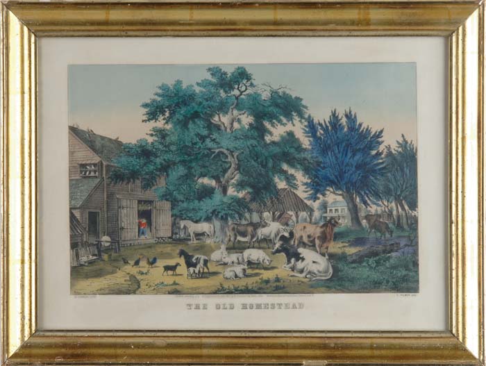 N. CURRIER (Publisher 19th Century) THE OLD HOMESTEAD. Conningham #4561. Medium folio colored lithograph scene shows a farm with house and barn and large trees. A variety of livestock is in barnyard. Dated 1855. Housed in a lemon gold antique frame. SIGHT SIZE: 12-1/2” x 17-1/2”. CONDITION: Very good. 9-73057 (200-300)