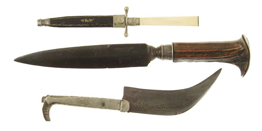 LOT OF THREE KNIVES. (1) “ARNACHELLUM / SALEM” is marked on the left side of a 7” spear point knife with 4-3/4” reverse. The grip is stag and has a fitted iron pommel, which is not the same quality as the rest of the knife. CONDITION: Moderate to heavy pitting to the blade & pommel and moderate wear on the grip. (2) 4-1/4” spear point boot knife with ivory handle & German silver mountings. No markings. CONDITION: Blade is fine. Ivory grip is split down one side. German silver fittings are fine. Most of the gold stamping remains on the leather scabbard. (3) An unmarked 4-7/8” hooked blade with brass inlay decoration. Iron handle is shaped like a high-top boot and is covered with German silver decorations. CONDITION: Light to moderate pitting on the blade. Some verdigris on the German silver. Exposed iron has dark brown patina. 4-53791 FS71 (400-650)