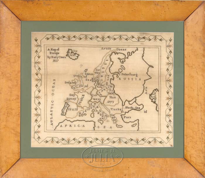 NEEDLEWORK MAP OF EUROPE BY MARY OWEN, 1837. A map of Europe bordered with a flower vine. The map showing countries and seas with black and brown borders. Title in upper left. Housed in a fine birdseye maple heavy frame with green matte. SIGHT SIZE: 16-1/2” x 20-1/2”. CONDITION: Very good, some light toning. 9-70838 (800-1,200)