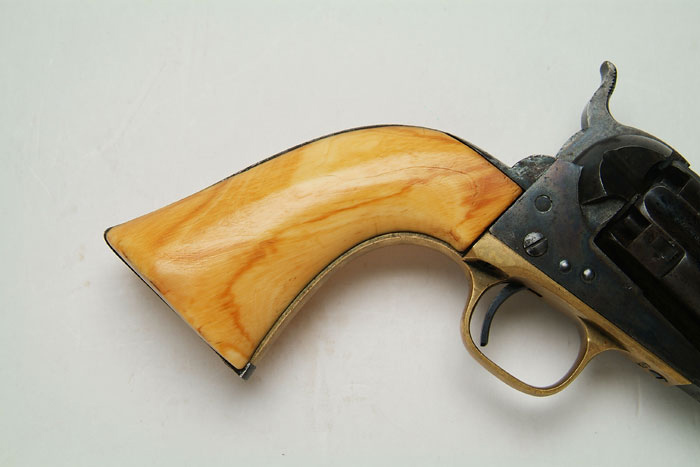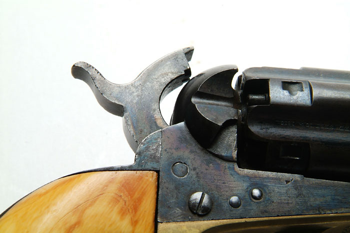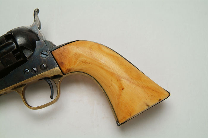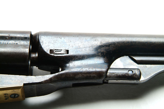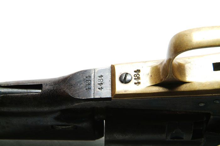 RARE CASED COLT MODEL 1860 FLUTED ARMY PERCUSSION REVOLVER. Cal. 44. SN 4484. Blue finish with 8″ rnd bbl, German silver front sight, 1-line Hartford address with 6-shot full fluted cyl, brass trigger guard & iron back strap with 1-pc ivory grip. It has a 4-screw frame cut for shoulder stock with flathead hammer screw & short rnd head screws in stock screw holes. Accompanied by an early red velvet lined orig Colt casing with beveled bottom edges, compartmented in bottom for revolver, a very early deep repoussed dbl sided Colt’s patent flask, “L” shaped nipple wrench, 2-cavity iron Colt’s patent mold with sprue cutter & a packet of Hazard Powder Co. cartridges. Only about 4,000 of these early Model 60’s were ever made and majority of them saw hard service during the Civil War. Few are ever encountered with condition. They are generally considered a Confederate weapon as a large shipment of them was sent South just prior to the beginning of hostilities. CONDITION: Revolver is very fine, all matching including wedge, with bbl retaining 60-70% glossy bright orig blue mixed with brown patina & scattered light surface rust on right side. Cyl retains about 40% flaked orig blue & frame most of its strong orig case colors turned dark on recoil shields. Hammer retains about 60% strong case colors. Trigger guard is a medium mustard patina & does not appear to have ever had silver plating. Back strap & butt strap retain about 90% glossy orig blue, flaked & dulling on back strap. Grip is sound with numerous age lines and retains a beautiful golden mellow patina. Mechanics are crisp, bright shiny bore with scattered light pitting. Case has a few grain checks in lid, otherwise is sound and retains generous amounts of its orig finish with one or two loose joints. Flask shows substantial wear & has a broken spring. Nipple wrench is near new & mold is mostly gray metal. Cartridge box & cap box are fine. 4-59003 JR33 (8,000-12,000)