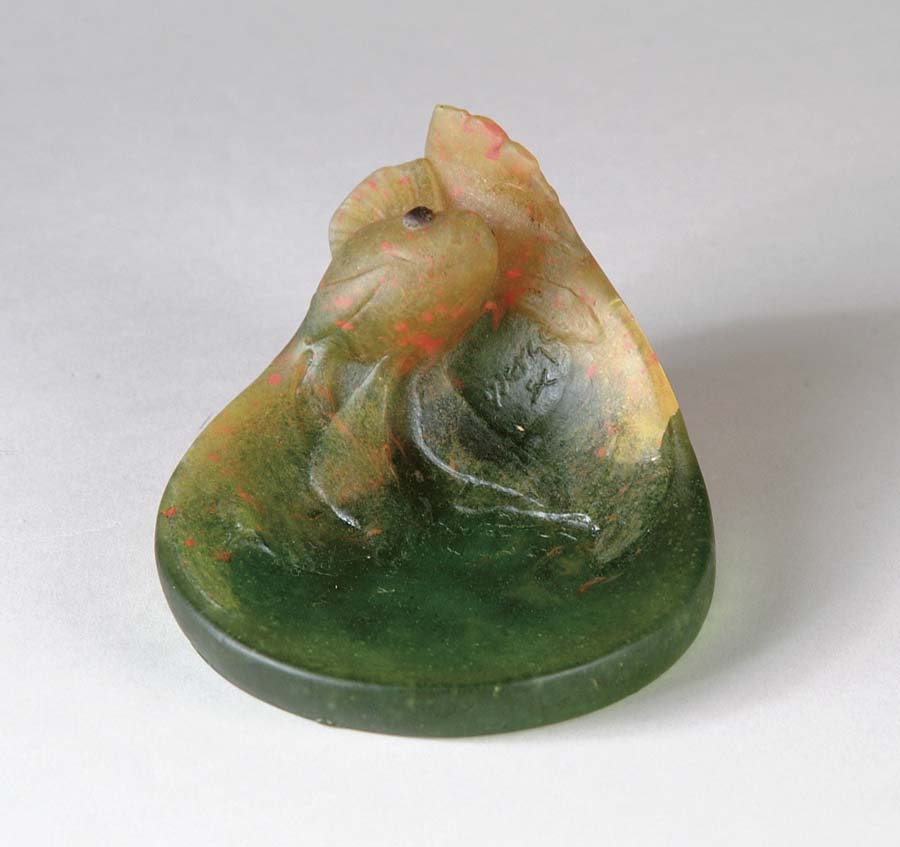 A. WALTER PATE-DE-VERRE TRAY. Decoration consists of two yellow and green fish with orange spots and brown eyes. Signed “A. Walter Nancy” and artist signed “Berge SC”. SIZE: 5-1/2” l. CONDITION: Very good to excellent. 5-71123 (3,000-5,000)