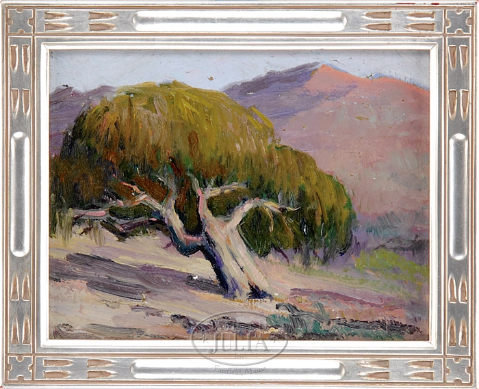 ARTHUR J. HAMMOND (American, 1875-1947) WESTERN LANDSCAPE. Unsigned oil on board scene shows a tree on desert floor with purple mountains in background. Housed in a small carved and silver gilt replacement frame. Work comes from a collection of signed and unsigned works by this artist. SIZE: Sight: 6-1/2″ x 8-1/2″. CONDITION: A few small chips, otherwise very good. 9-92702 (500-800)