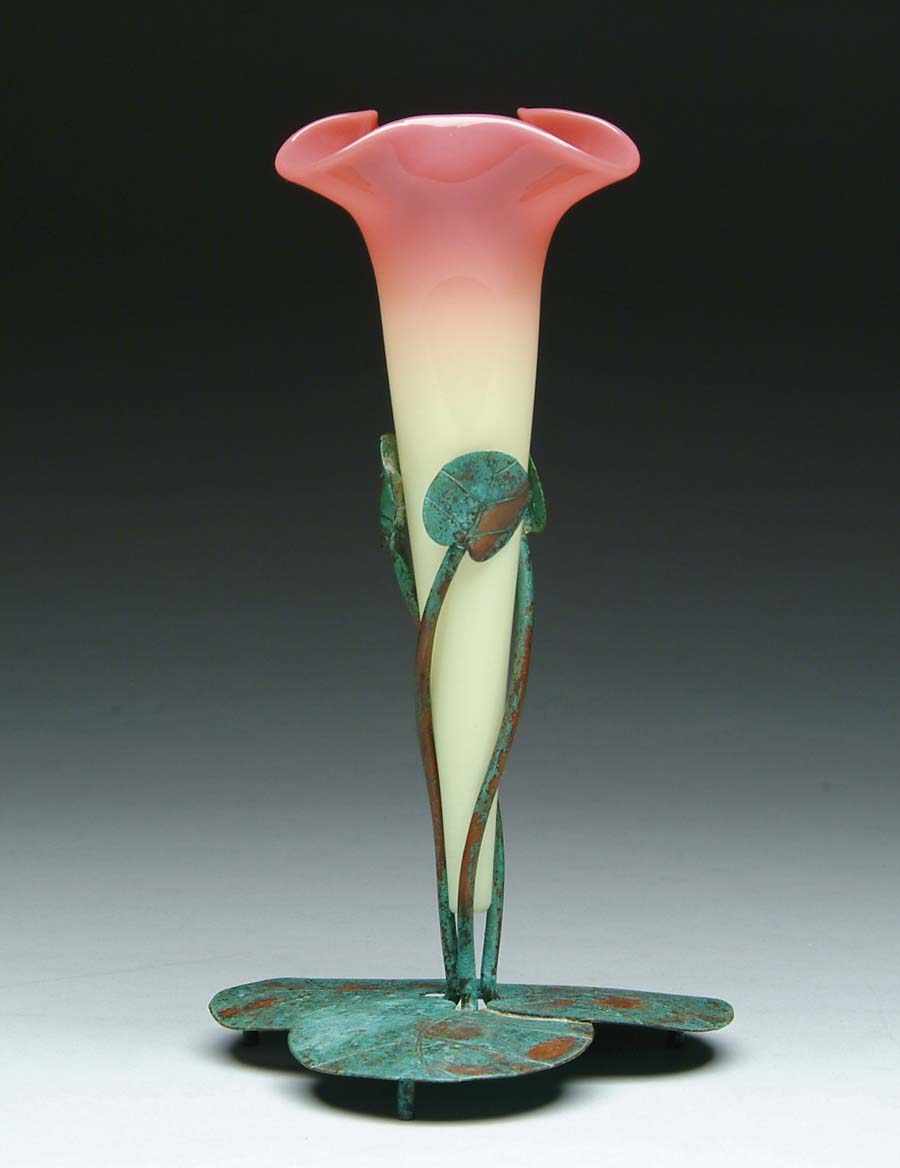 BURMESE TRUMPET VASE IN METAL HOLDER. Lovely Burmese glass insert has glossy finish, ruffled top in a metal pond lily holder. SIZE: 10 in. t. CONDITION: Very good to excellent. 5-60261 (300-500)