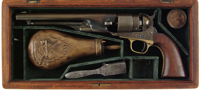 MARTIALLY MARKED CASED COLT MODEL 1860 ARMY PERCUSSION REVOLVER. Cal. 44. SN 68912. Usual configuration with 8” rnd bbl, German silver front sight & 1-line New York address. It has brass trigger guard & iron back strap with 1-pc walnut grip. Grip has a cartouche on each side, along with a small carved American flag near left heel. There are tiny inspector marks on various parts. Mahogany casing, while a nice fitted case, is not from Colt. It is green velvet lined, compartmented in bottom for this revolver, a large 1-sided “COLT’S PATENT” flask, a “COLT’S PATENT” iron mold with sprue cutter and inspector initial “S” on right side. It also has an “L” shaped nipple wrench and a functioning key. Right rear corner has a compartment with a lacquered Eley’s cap tin. Lid has a paper label, directions for loading Colt’s pistols. CONDITION: Fine, all matching except wedge which has numbers “7819” and “849”. Bbl retains about 35% strong orig blue, mostly in sheltered areas with most of top of bbl a smooth, even, light brown patina. Right edge of muzzle is very heavily worn with numerous small nicks. Cylinder is a gray patina with a couple of small dings & retains 85-90% orig Naval battle scene. All six safety pins are prominent. Frame retains traces of case colors in very sheltered areas with balance a light silver brown patina. Hammer retains 50-60% faded case colors. Backstrap & buttstrap retain 30-40% orig blue, mostly a blue/brown patina on backstrap. Grip frame is a medium mustard patina. Grip is sound with moderate edge wear & a few small nicks and retains a hand polished patina. Cartouche is not legible on left side but is mostly legible on right side. Case is fine, retaining most of an old refinish on outside with light fading and light soil in bottom. Label in lid is tattered. Flask has several dents but appears to be sound & functional. Mold is very worn. There is one loose partition in bottom. 4-60338 JR437 (4,000-7,000)