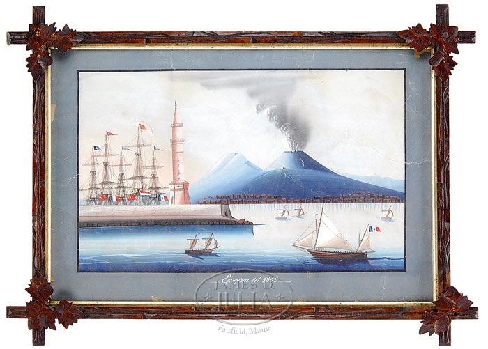 UNSIGNED (19th/20th Century) TWO VIEWS OF MT. VESUVIUS. Gouache on paper scene shows Naples harbor as seen in 1868. The eruption of Mt. Vesuvius is seen in one with bright fire, the other with gray smoke. Many boats are seen in the harbor with the city beyond. Titled in margin in white on gray. Housed in black walnut Victorian frames with naturalistic leaf elements and gold liner. SIZE: Sight: 18″ x 27-1/4″. CONDITION: One having light stains, the other with side tears which penetrate image and losses on border. Not examined out of frames. Fair to good. 9-92602 (1,200-1,600)