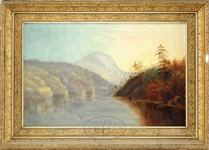 UNSIGNED (Hudson River School, 19th Century) SAILING ON THE RIVER. Oil on canvas scene shows a sailboat on a large river with tree lined hill banks and rounded mountain in distance. The sun casts bright yellow sky on pink clouds. Housed in its original gesso decorated gilt frame. SIZE: 16″ x 25″. CONDITION: Very good, light craquelure. 9-92659 (300-500)