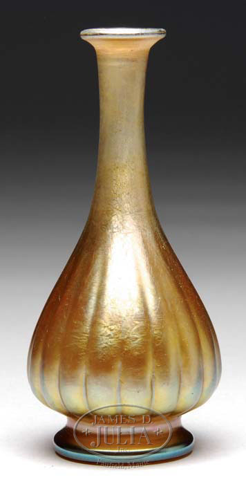 TIFFANY FAVRILE RIBBED VASE Highly unusual genie-style vase is decorated with vertical ribbing with soft overall iridescence. Signed on the underside “L.C. Tiffany Favrile 1042-15986N”. SIZE: 5″ t. CONDITION: Very good to excellent. 5-65125 (500-1,000)