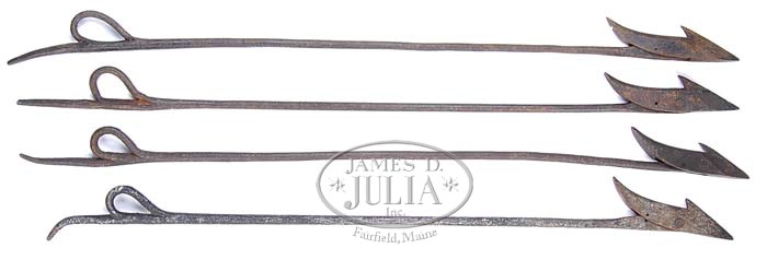 4 DARTING GUN HARPOONS. 2nd half 19th century. Each single-flue toggle iron mounted to the shaft, the opposing end with an iron loop forge welded to the shank just forward of the tapered iron tang. The purpose of the loop was for attaching the whaleline. One tip with stippled mark of the maker’s initials “LR”. SIZE: Ranging 36″ l. to 38-1/2″ l. PROVENANCE: From an extensive private collection. CONDITION: All with varying degrees of pitting and rust. Good overall. 9-95070-8 (800-1,200)