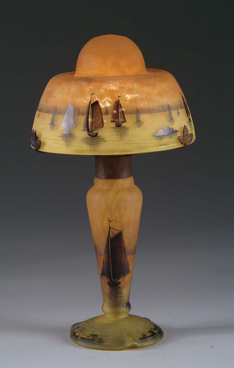 DAUM CAMEO NAUTICAL LAMP. Exceptional Daum cameo lamp has cameo and enameled sailing ships against an internally decorated orange and yellow mottled body. Sailing ships are enameled in shades of brown and black with shadows to indicate a nighttime harbor scene. The foot of the lamp is decorated with cameo and enamel rocks extending out of the water. The shade is cut and decorated to match the base. Signed on the underside of the base “Daum Nancy” with the Cross of Lorraine and “65”. SIZE: Shade is 7-1/2″ dia. Overall height is approx. 14″. CONDITION: Missing two mounting screws on metal collar, otherwise very good to excellent. 5-70792 (10,000-15,000)