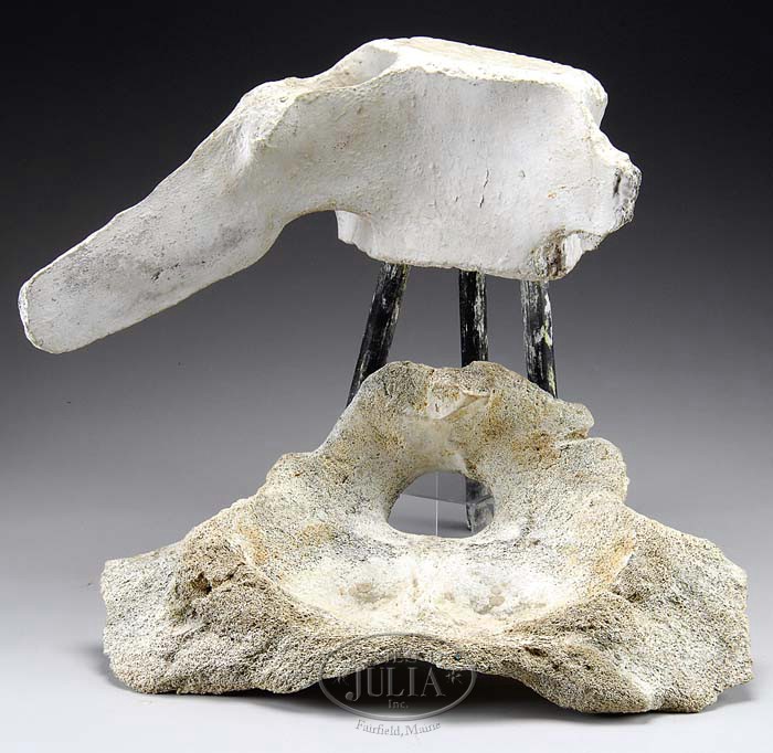 2 WHALING ARTIFACTS. Comprising a footstool fashioned from the vertebra of a whale and mounted with cylindrical iron legs. Accompanied by an unmounted saddle-form vertebra. SIZE: 1ST: 20″ h. x 20″ w. x 23″ d. 2ND: 22″ x 16″. PROVENANCE: From an extensive private collection. CONDITION: Both appear to be weathered examples, perhaps recovered from seashore. 9-95066 (800-1,200)