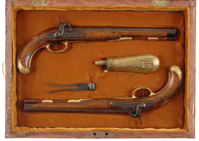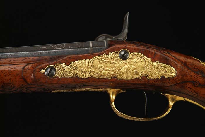 FINE PAIR OF KUCHENREUTTER CONVERSION PISTOLS. Cal. 50. SN 20. 11” ribbed bbl. Walnut stock. “.Ioh. And. Kuchenreutter.” inlaid in silver on top of bbl. Sunken gold cartouche with knight on horseback is at rear of bbl. This John Andreas Kuchenreutter was the second of that name to work in Regensburg, Bavaria. He worked from 1780 to 1800. These pistols were converted to percussion at a later date. There is also silver wire inlay on bbl. Lock and hammer are relief carved with figures of a running stag being chased by a dog surrounded by floral scrolls. Front of lockplate has complete coverage of floral scrolls in the area where flintlock parts were removed. Gilt bronze mounts are relief carved in shell and scroll patterns with central vignettes of animals, three dogs on sideplate, seated stags on thumb piece and butt cap and a standing hunter on triggerguard. Ramrod pipes are faceted. SN is branded in the wood between tail of lockplate and rear of triggerguard bow. Tips of the ramrods are horn to match the tips of the forearm. Stock is relief carved with fancy scrolls and simple lines around bbl tang and between triggerguard and tailpipe. Folding rear sights are numbered 1 and 2, confirming that they were part of a pair. Triggers are single set. Accompanied by an American flask and a British bullet mold of the wrong size. CONDITION: Fine, with 40% blue on the bbls, bright blue-brown patina on the locks, worn on edges with widely scattered specks of surface rust. Wood is excellent with minor handling marks. Furniture retains virtually all of the gold finish. Mechanically fine. 4-30304 FS69 (5,000-10,000)