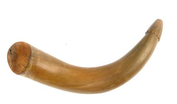 EARLY LARGE POWDER HORN. Very fine undecorated greenish squad size horn 20” overall with thick pine base plug secured with tiny square pegs. 2-3/4 of the tip is faceted carved with a scalloped edge, the plug has a large iron staple strap hanger. There is a small sticker attached that states this horn was from the “John Frew estate, Frewsburg, NY”. CONDITION: Fine and sound, the plug has several grain checks with evidence of hard use, no bug holes. 4-49189 JR289 (400-600)