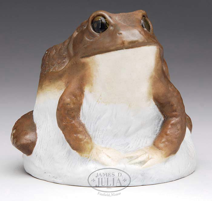 FIGURAL FAIRY LAMP. Ruf Fig. 385. Figural frog in shades of brown with amber eyes and sloping rear opening. SIZE: 4-1/2″ t x 5-1/2″ w. CONDITION: Very good with tiny nick on back top edge of piece. 5-66972 (200-400)