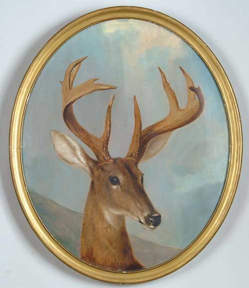 ATTRIBUTED TO THOMAS H. HINCKLEY (American, 1813-1896) TROPHY STAG. Oval oil on canvas head portrait of a majestic stag/deer with large antlers. Set against a gray and white/blue sky and sloping hill. Oval gilt wood frame. The canvas back has old writing which appears to say “Thos H Hin”. SIZE: 30-3/4” x 25-1/4”. CONDITION: Very good. 9-99567 (1,000-1,500)
