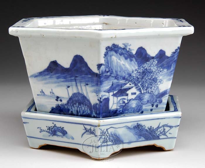 RARE AND UNUSUAL CHINESE EXPORT CANTON PLANTER WITH MATCHING UNDERTRAY. Mid 19th C. Of octagonal form with flared rim. Sides painted in an Oriental landscape with a matching and conforming undertray decorated in blue and white scenic motif on bracket feet with a shaped apron. SIZE: 6-1/2″ h overall; Planter is 10-1/2″ w. PROVENANCE: Ex-Collection of Matthew & Elizabeth Sharpe, PA. CONDITION: Very fine overall with nominal wear to glaze around edges and minimal glazing chips. 9-91417 (2,000-3,000)