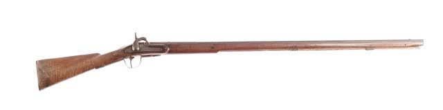 FINE EARLY INDIAN TRADE MUSKET. Cal. about 64. Fine early musket with 42” oct to round bbl with full-length uncapped stock secured with three pins, tiny blade front sight with a fixed rear sight, raised British style teardrop side panels and a raised teardrop panel around the upper tang. Sideplate is a 6-1/4” long heavy brass serpent and it has a large iron trigger guard with smooth finials. Lockplate is an American replacement. Buttplate is flat brass with a short round tang secured with four screws in the butt and one in the tang. CONDITION: Good. Bbl retains an even dark brown patina with light fine pitting, heavier and deeper near the breech end. Stock has a break with several small cracks through the action area. Otherwise, shows normal use and handling. Ramrod is a replacement and the wood retains most of an old refinish. Mechanics are fine. 4-48933 JR709 (2,000-3,000)