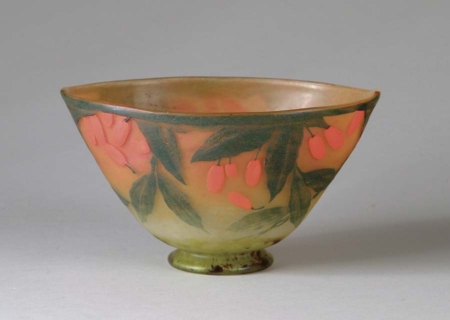 DAUM NANCY PADDED BOWL. Wonderful footed bowl features padded and wheelcarved orange berries with green leaves and stems against a mottled background of orange shading to citron. Signed on the side in cameo “Daum Nancy”. SIZE: 7-1/4” w x 4-1/4” t. CONDITION: Very good to excellent. 5-71141 (5,000-7,000)