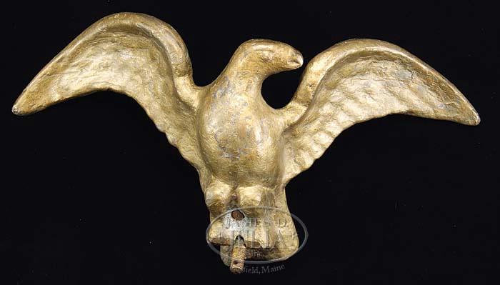 CAST IRON PILOT HOUSE EAGLE. Of small size, American, First quarter of the 20th Century. Cast as a displayed eagle with two threaded mounting rods beneath tail with gilded surfaces. SIZE: 13′ h x 23″ w. CONDITION: Heavy casting in fine original structural condition. with old re0gilded surfaces. 9-95738 (800-1,200)