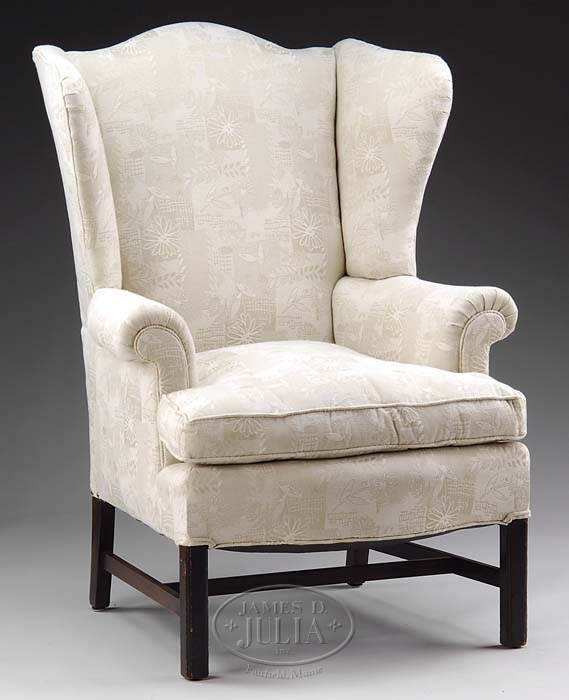 GEORGE III STYLE WING CHAIR. Circa 1900. Rectangular padded back with serpentine crest flanked by ogival wings and rolled arms. Seat rail bowed and serpentine. Raised on square tapered legs with molded edges and joined by a recessed boxed stretcher. Covered in a floral damasque upholstery. SIZE: 44″ h to top of back. CONDITION: Very good to excellent. 9-91358 (400-700)