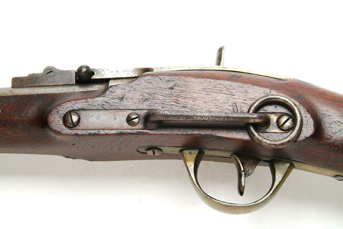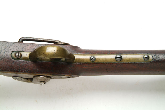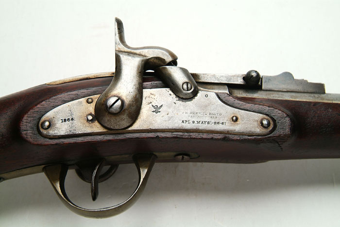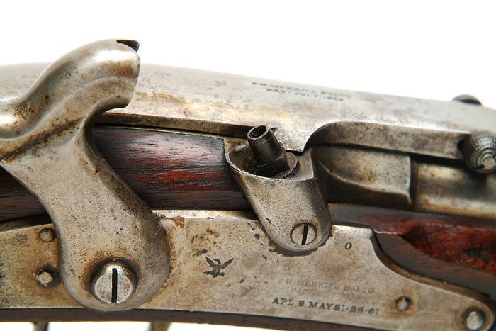 MERRILL FIRST MODEL CIVIL WAR CARBINE. Cal. 52. SN 19070. 22” rnd bbl. Standard 4-line markings on lockplate and 2-line markings on operating lever. Dated 1864 on tail of lock. No visible cartouche, although many parts have an “O” inspector mark. Brass buttplate, trigger guard, and bbl band. CONDITION: Good. Gray patina mixed with surface rust and light pitting on iron parts, dark patina on brass. Stock is fine with minor handling marks. Mechanically excellent. Wm. Hancock Collection 4-58588 FS700 (2,000-2,500)