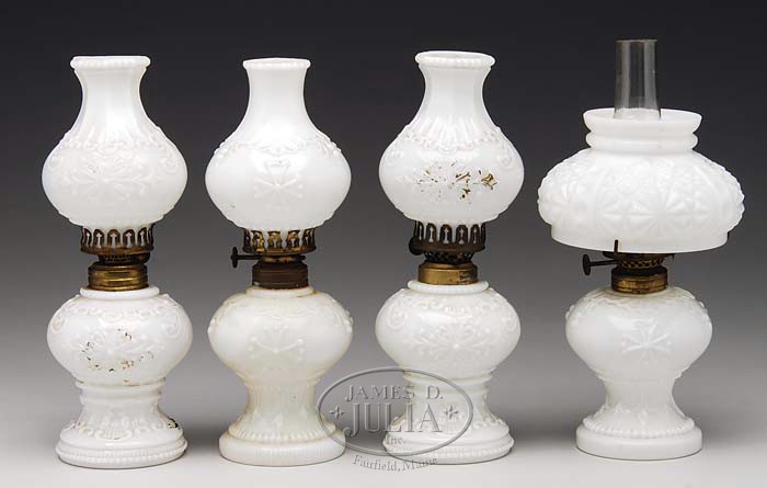 FOUR WHITE MILK GLASS MINIATURE LAMPS. SI-210 & SI-211. Milk glass with embossed medallions. Hornet burners. SIZE: 9-1/4″ t. CONDITION: Generally good with some roughness to shade fitter edges, one lamp has a replacement shade. 5-67193 (200-400)