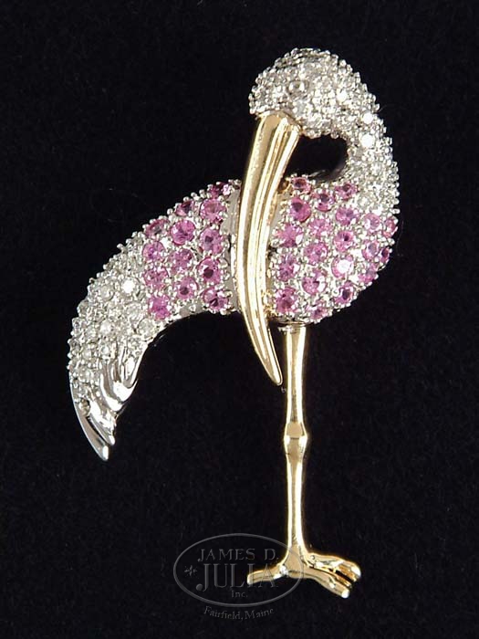 DIAMOND, PINK SAPPHIRE AND 14K YELLOW AND WHITE GOLD BIRD BROOCH. The feathers and body paved with pink sapphires and diamonds on a white gold base. The legs and beak in yellow gold. Unmarked. Weight of diamonds is approximately .59cts and weight of the sapphires is approximately 1.25. SIZE: 1-3/4” h x 1” w. CONDITION: Very good. 9-70052 (700-1,000)