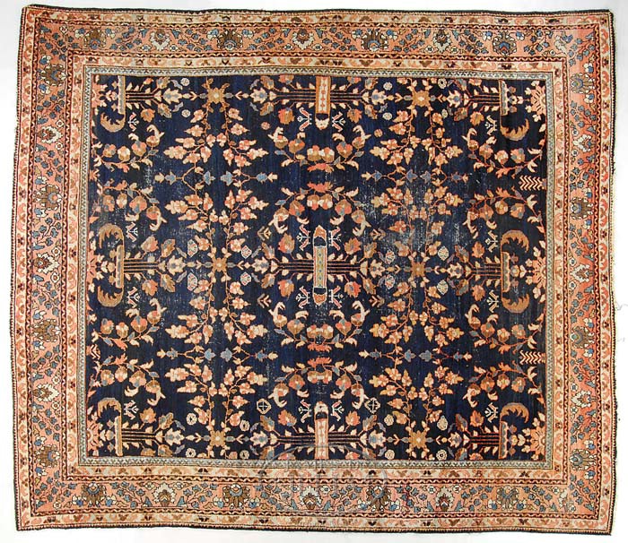 MAHAL ORIENTAL CARPET, CENTRAL PERSIA. Circa 1900. With an unusual design incorporating three rows of three stylized floral bouquets on a blue-black field of dense polychrome floral vinery within a rose guard border of floral sprays in greens, blues and other earth tones. SIZE: 11′ x 9’3″. PROVENANCE: From an East Sangerville, Maine private collection, by descent from Dr. Samuel Cox Hooker (1864, Brenchley England -1935, Brooklyn Heights, New York), a sugar chemist, magician, and art collector, to the present owner, a great-grand-daughter. CONDITION: Overall wear with low pile, ends and sides intact, foundation intact. Good overall. 9-94924 (2,000-3,000)