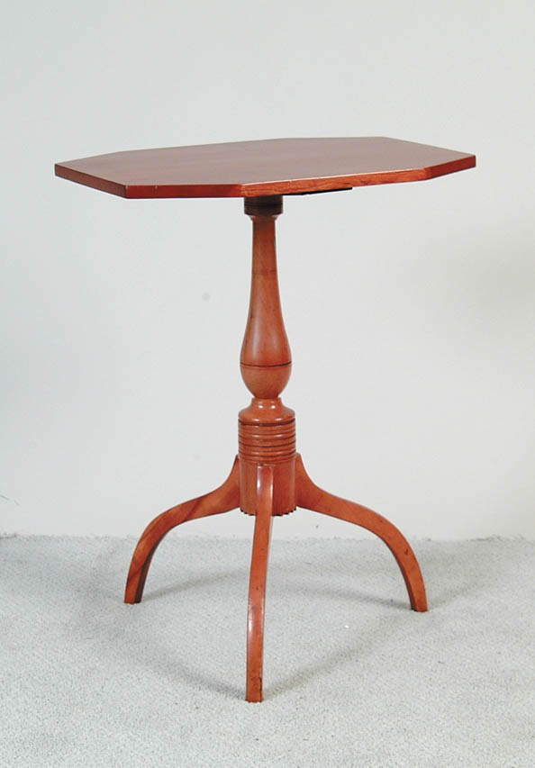 HEPPLEWHITE CHERRY CANDLESTAND. Original one board top of rectangular form with canted corners. Baluster and ring turned shaft, raised on three nicely carved arched legs, notching to bottom of post. Nicely refinished. Fourth quarter of the 18th Century. SIZE: 28” h x top 16-1/4” x 21”. CONDITION: Very good. 9-95735 (500-750)