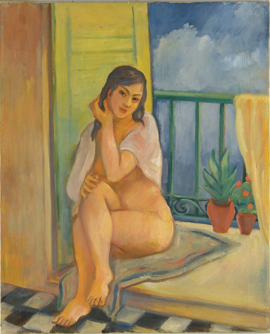 BERNARD KARFIOL (American, 1886-1952) SEATED NUDE. Oil on canvas scene shows girl seated on towel at balcony edge with white towel at shoulders. Two potted plants are at edge of balcony and her feet rest on a checkerboard floor. Unsigned front canvas. Back stretcher has glued paper penned script signature “Bernard Karfiol”. Also black grease pencil “A 399”. The sitter is seen in several different Karfiol paintings. Housed in a gilt replacement frame. SIZE: 22-1/4” x 18”. CONDITION: Very good. 9-97415 (800-1,000)
