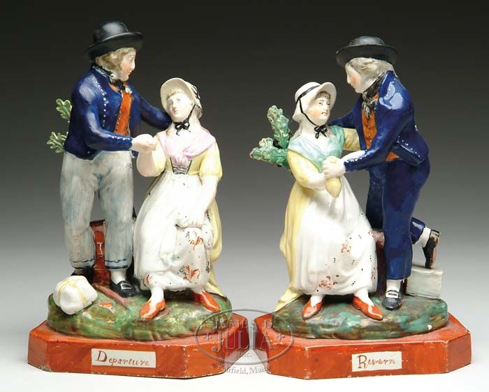 PAIR OF STAFFORDSHIRE POTTERY “DEPARTURE” AND “RETURN” GROUPS. Each on a cut corner base with title “Departure” and “Return”. Each figure shows a woman seated on a brick wall being consoled by a man wearing blue outfit and black hat. One shows her with sad face, the other with happy face. PROVENANCE: Rankin Estate, Annapolis, Maryland. SIZE: 9-1/2” h. CONDITION: Some minor small chips to back leaf and to base. Some touch up paint and restoration to bonnets. Otherwise good. 9-29709 SM (1,000-1,500)
