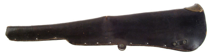 SCARCE 7TH CAVALRY CARBINE SCABBARD. Made at Rock Island Arsenal and so marked at top on left side. Made of heavy harness leather, 31” long with a stepped sewn edge with harness rivets. It has a strap loop on each side, also with copper harness rivets & an iron ring about mid-point. It also has a brass collar at top front edge. Top right side is stamped “TROOP / K / 7 CAVALRY” & the number “23”. CONDITION: Fair to good. Shows heavy wear with mouse chewings at tip, is dry & crackled but has been treated. There is a dry break about mid-point on folded edge & there are some losses on sewn edge. It appears that there were nine rivets, after market installed, on sewn edge that have been removed. 4-59073 JR284 (500-1,000)
