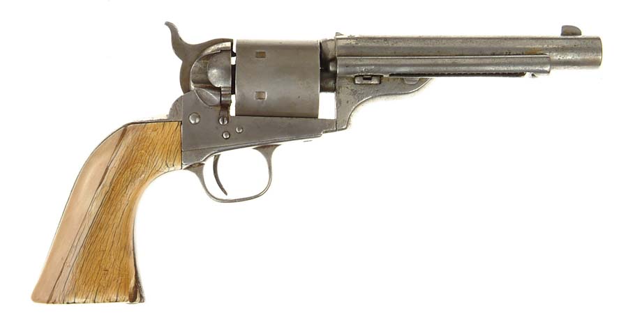 COLT MODEL 1871/72 REVOLVER. SN 4138 all matching except wedge. Cal. 44 CF. 5-3/8” rnd bbl. The bbl has been shortened and a new rear sight placed at the front of the bbl marking. Two line patents with dashes on the left side of the frame. CONDITION: Metal surfaces cleaned with some light pitting and dents remaining. Ivory grips have been repaired with the rear of the right side replaced and the front of the right side missing. Firing pin nose has been altered from rimfire. From the collection of the late Bruce McDowell. 4-54671 FS168 (800-1,500)