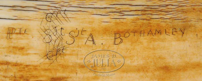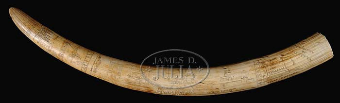 IMPORTANT SCRIMSHAW TUSK FROM NAPOLEONIC WARS. 1st quarter 19th century. This rare British example traces two military campaigns. The first carvings depict the “TERRITORY OF CALCUTTA” (Calcutta) with a rendition of Fort William on the “RIVER HOOSLEY” (Hooghly). Next is a depiction of a large fort with British flag and the names “ASSAYE” and “MOHAULPORT”. The battle of Assaye, September 23, 1803, was part of the Second Mahratta War in India; Mohaulport is a village where a battle was fought on November 1, 1803. Both were part of the Anglo-Mahratta campaigns. The central section of the tusk is scrimmed with the symbol of King George III, an officer on horseback brandishing a sabre and the name “SIR ARTHUR WELLESLEY” (1769-1852), the first Duke of Wellington, and a British officer in command of British troops during the Anglo-Mahratta campaigns. The next panel depicts two soldiers facing each other, separated by the name “ALEPPI” (also India). The last panel is scrimmed with the names “CORUNNA” and “ROLICA” centering a church. The Battle of Rolica in Portugal was fought on August 11, 1808; the Battle of Corunna in northwest Spain was fought on January 16, 1809. Both battles were part of the Napoleonic Wars and both were under the command of Lieutenant General Arthur Wellesley. The name “SGT. A. BOTHAMLEY” and “45TH FOOT” are lightly scrimmed on the reverse of the tusk. At the time of cataloging, we were unable to locate archival records for an A. Bothamley, 45th Foot, in the aforementioned campaigns. We did find an Arthur Thomas Bothamley, 24th Foot, in India in 1844. SIZE: 28″ l. PROVENANCE: From a private collection. CONDITION: Very good overall, with good color and patina. 9-94991 (8,000-12,000)