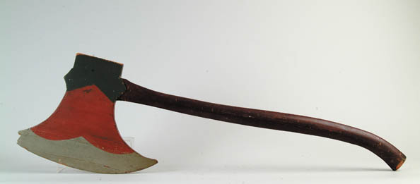 FINE PAINTED WOOD FIREMAN’S PARADE AX. Long natural stained curved handle. Large blade painted silver, red and green. SIZE: 43-1/2” l 13-1/2” w. CONDITION: Blade has several old repairs and notch off tip. 9-94953 (400-800)