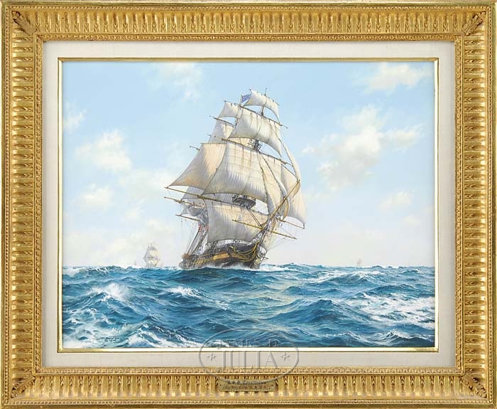 ROY CROSS (American, 1924-) U.S.S. CONSTITUTION. Outstanding gouache nautical scene shows the majestic Constitution sailing under full sail in white capped blue sea. The ship leads four other tall ships coming toward viewer. Great detail is shown in the ships rendering including rigging, deck and deck hands. The scene is shown under a light blue and white cloud sky. Signed lower left “Roy Cross” and Copyright “1976”. Superbly housed in a fine gesso decorated gilt frame with linen and gilt liner. Also having a decorative title and artist plaque. The Constitution is shown circa 1804 and depicts it as the flagship of the US Mediterranean Squadron under Captain Edward Preble. SIZE: 22″ x 30″. PROVENANCE: Purchased by our current consignor from Marine Arts Gallery in 1977. A copy of the original receipt accompanies the painting. CONDITION: Very good to excellent. 22″ x 30″. 9-91345 (10,000-15,000)
