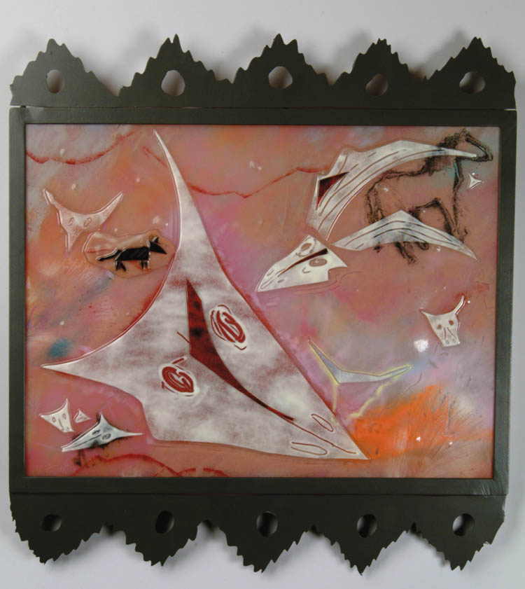 CONTEMPORARY FUSED GLASS PLAQUE. Wonderful plaque depicts animal skulls and Southwest hieroglyphics centered with a large stylized cow skull with other smaller skulls surrounding. Also has outline of a horse in one color reminiscent of Southwest hieroglyphics. Framed in a cutout steel frame. SIZE: Glass is 23 1/4″ by 17 1/2″. Overall size: 23 3/4″ by 25″. CONDITION: Very good to excellent. 5-67865 (300-500)