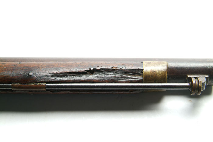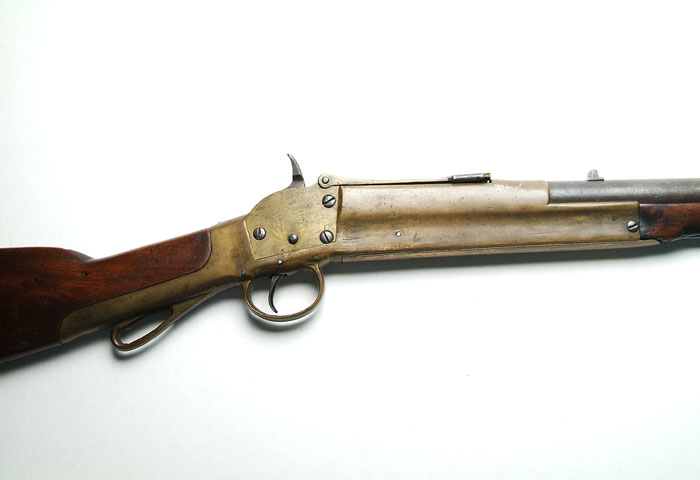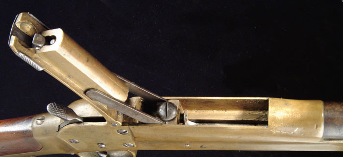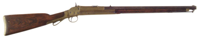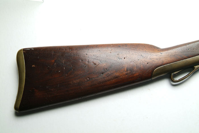 RARE CONFEDERATE BRASS FRAME 2nd TYPE MORSE CARBINE. With less than 1,000 of these made during the Civil War and far less survivors, this carbine represents one of the great rarities in small arms collecting. This unusual breech loading brass frame carbine was of a design invented by George W. Morse. These were made at the State Military Works in Greenville, SC about 1862-1863 from machinery that was captured from the U.S. Arsenal at Harpers Ferry in 1861. The carbine has a 20” rnd bbl in .50 cal. with an upward tilting breechblock. The elongated frame is of brass along with all other furniture. The trigger guard is cast integral with the frame with a small looped grip behind. SN 383 stamped on the bottom of the frame. Stocks are of butternut. Iron cleaning rod with segmented circular tip is housed beneath the barrel. The orig rod accessory is housed in the butt plate. A highly desirable Confed. production breech loading carbine-produced largely for SC State troops. CONDITION: Very good. Carbine shows medium wear over all with a nice uncleaned dim yellow patina on all of the brass frame and furniture. Bore is clean and quite sharp with no visible pitting. Stocks show the usual dents and dings from normal use. There are a couple of old, worn losses to the forestock right behind the nose cap and the area where the forestock meets the brass frame-a few chips are missing. A couple of the screw heads are chewed up a bit. Mechanically fine. Edwards Collection 4-58550 CW3 (11,000-14,000)