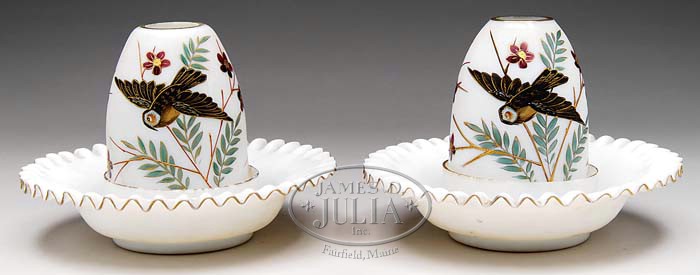 PAIR OF BRISTOL FAIRY LAMPS. White Bristol fairy-size dome decorated with bird and floral decor sitting in an undecorated matching lamp cup which then rests in a low underbowl with crimped edge. SIZE: 5-1/4″ t. CONDITION: One shade is cracked, the other shade has minor roughness on its bottom edge. The lamp cups have minor roughness to their upper edge. There is wear to the gold trim on all pieces. 5-67013 5-67014 (200-400)