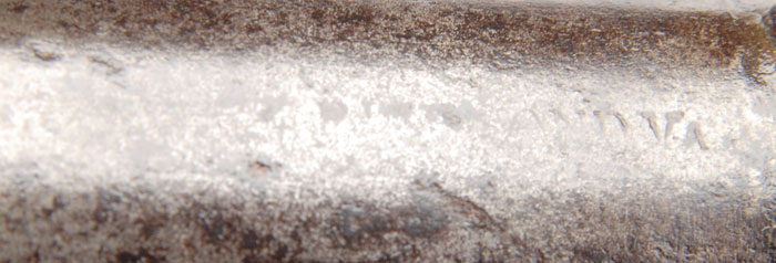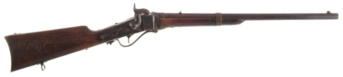 CONFEDERATE RICHMOND SHARPS. Cal. 52. SN 4658. 21” bbl is marked rear of sight, “RICHMOND, VA” and retains front &rear sights. SN 4658 appears on bottom of bbl, tang, & lock-plate. Forestock is retained by sgl brass spring-retained band. Butt-stock has initials, “MDC” carved into it. Stock terminates at the correct brass butt-plate. Gun appears orig and authentic in every regard, including breech block which was often discarded in the field and replaced with a U.S. breech block. CONDITION: Metal surfaces are grey/black with scattered pitting. Brass butt-plate, barrel, band, and screw ferrule all exhibit dark brown color. Butt-stock is sound with a couple small cracks. Several chips occur along lock-plate. Forestock has repaired crack about 3” long. SN markings are all well struck. “RICHMOND, VA” marking is only partially discernable. Bore is pitted but has distinct well defined rifling. 4-59158 JS34 (10,000-15,000)