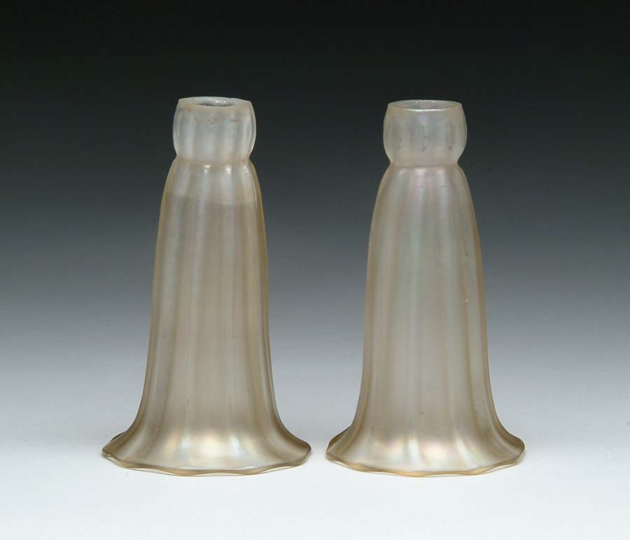PAIR OF STEUBEN LILY SHADES. Beautiful pair of Steuben Verre de Soi lilies have ribbed body and nice iridescence. One shade is signed with silver Fleur de Lis at the fitter. SIZE: 5 in. t. CONDITION: One shade has hairline at fitter and slightly into body, otherwise very good to excellent. 5-61470 (300-500)