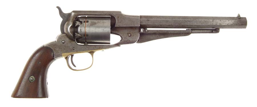 REMINGTON MODEL 1861 ARMY CONVERSION REVOLVER. SN 10609. Cal. 44. 8” oct bbl. Inspector marks on major parts. “BH” cartouche on the left grip; none on the right. The rear of the cylinder was cut off and firing pins inserted for each of the chambers. CONDITION: Smooth gray patina with traces of orig blue. Grips are very good and the action is fine. From the collection of the late Bruce McDowell. 4-54676 X139 (1,000-2,000)