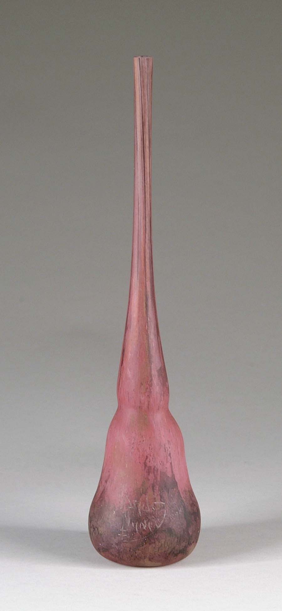 DAUM STICK VASE. Very nice Daum stick vase has subtle double gourd shape in opaque mottled glass with shades of pink, green and brown mottle throughout. Signed on the side with engraved signature “Daum Nancy”. SIZE: 16” t. CONDITION: Very good to excellent. 5-71865 (1,200-1,500)