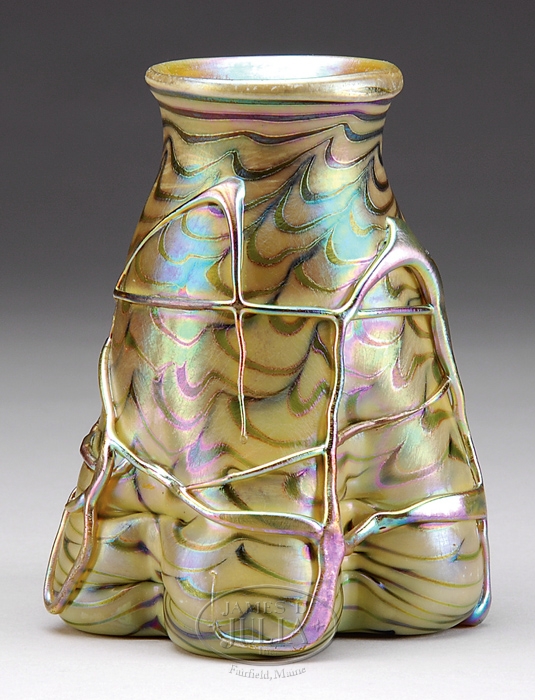 FINE ART NOUVEAU VASE. Extremely fine iridescent vase has green iridescent wave design around the organic shaped body with slightly iridescent cream colored background. Vase is encircled with gold iridescent random threading and is finished with a gold iridescent interior around the mouth. Similar vases have been sold by other auction houses as Tiffany favrile and this vase carries an original Tiffany paper label, however we are not positive it is a Tiffany vase. At any rate, it is an outstanding piece of organic Art Nouveau design. SIZE: 5-1/4″ t. CONDITION: Very good to excellent. 5-66134 (1,500-2,500)