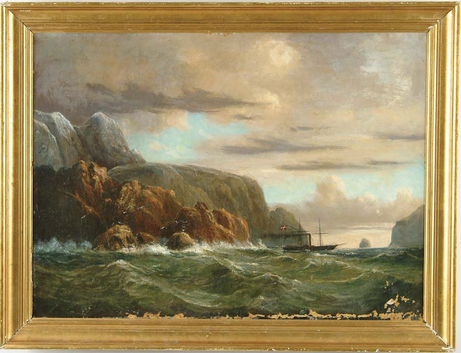 UNSIGNED (European, 19th C) STEAMER OFF ROCKY COAST. Oil on canvas shows steam and sail ship flying red flag with white cross sailing left to right away from large coastal cliffs. Choppy green and white sea. Gray and white clouds with blue sky. Housed in a molded wood gilt frame. Back of stretcher is initialed, possibly the artist, “E. S. 61”. Also several Danish framing labels on back of frame. SIZE: 23” x 31-3/4”. CONDITION: Restoration, inpainting and significant flaking and chips to bottom. Otherwise good. 9-97070 (300-500)