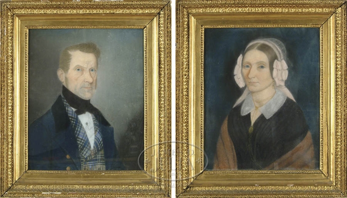 UNSIGNED (English, First half of the 19th Century) PORTRAITS OF A MAN AND A WOMAN. Pastel on paper portraits show a man with blue formal coat and plaid vest with white shirt and black cravat. The woman has a black dress with lace collar and she wears a red shawl over arms. Her pink bonnet has decorative ruffled ends. She also wears gold earrings, necklaces and slide chain. Identically housed in period gilt feather decorated frames. SIZE: 15-1/2” x 13”. CONDITION: Generally very good. 9-29047 (800-1200)
