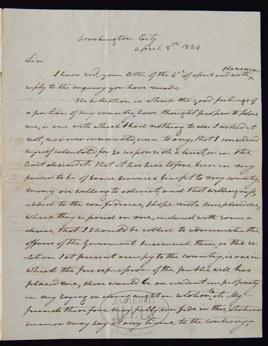 ANDREW JACKSON (1767-1845) SIGNED LETTER. 7th President. 8” x 10” autographed letter signed, two pages with a second free frank signature on the reverse, Washington, April 8, 1824. To Iona Dayton of New Jersey. “…The situation in which the good feelings of a portion of my country, have thought proper to place me, is one with which I had nothing to do. I asked it not, nor was insinuated, even to any, that I considered myself calculated for so responsible a trust, or in the least desired it. That it has heretofore been in my power to be of some service & benefit to my country, many are willing to admit; that willingness added to the confidence, I hope not a misplaced one, which they reposed on me, induced with some a desire that I should be called to administer the offices of the Government. Inasmuch then, as the relation I t present occupy to the country, is one in which the free expression of the public will has placed me, there would be an evident impropriety in my saying or doing aught in relation to it. My friends therefore may fully confide in this, whatever another may say at any time to the contrary, that under no circumstances shall I be found entering in to arrangements, plans, or even be___with any. The people have placed my name before the country, it is of course a matter with which they, not I, have anything to do. It would be a matter of great satisfaction to me (should I be called to act,) that the good opinion you and others are pleased to entertain toward me, shall in nothing be forfeited. My object then, as it was has been, will be to discharge my duty properly, & with a view to the best interest of my country…” In 1824, Jackson, representing the Democrats, ran against John Quincy Adams and Henry Clay. Adams received fewer electoral votes and fewer popular votes required for victory, so the United States House of Representatives decided the election on February 9, 1825. Thirteen state delegations voted for John Q. Adams, seven for Jackson, and three for Crawford. Since Henry Clay finished fourth in electoral votes, he was not eligible for selection by the House. However, as Speaker of the House, he threw his support behind Adams and was subsequently appointed Secretary of State, leading critics to call the appointment the “Corrupt Bargain”. By 1828 Jackson had garnered enough support to win numerous state elections and control of the Federal administration in Washington. 9-71975 (12,500-17,500)