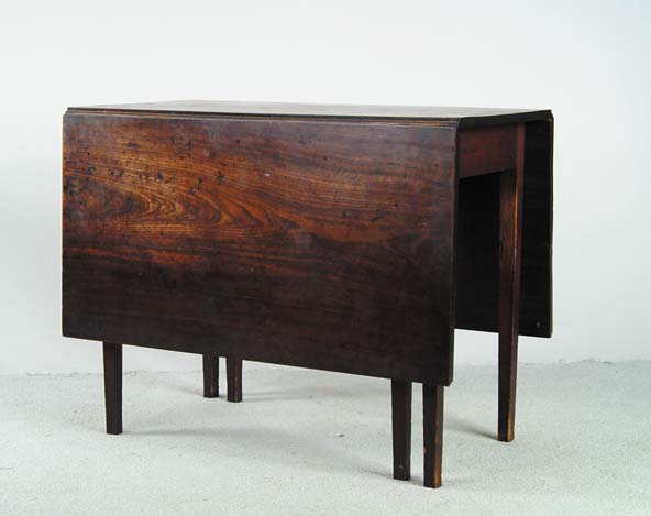 MAHOGANY DROP LEAF GATELEG DINING TABLE. Hepplewhite style with tapered square legs with single board top and leaves. Six legs, two being pullout to support leaves. Leaves have molded edge which may have received extensions. Old finish. Circa 1800. SIZE: 28-1/2” h x 36-1/4” d x 55-1/2” (open); 18” (closed). CONDITION: Very good, some stains to top. 9-96564 (800-1,200)
