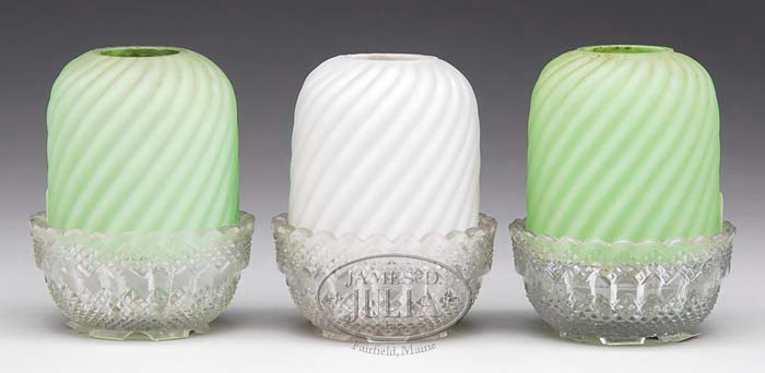 THREE SWIRLED FAIRY LAMPS. Ruf Fig. 5. Pyramid-size domes with embossed swirl in signed clear lamp cups. Two shades are lime green, the third is white. SIZE: 3-3/4″ t. CONDITION: Very good with minor roughness on top edge of white shade and one green shade. Lamp cups are very good. 5-67114 5-67128 (200-400)