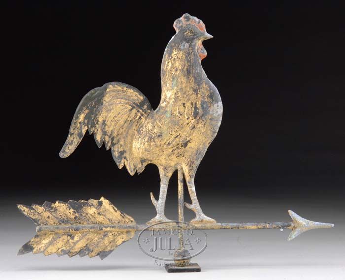 AMERICAN FULL BODIED GILDED COPPER GAME COCK WEATHERVANE. The gilded body with sheet metal tail, wattle in red paint perched on a arrow directional with zinc head and sheet metal fletching. SIZE: 15-1/2”h overall x 19-1/4”l overall. CONDITION: Very nice weathered surface with expected losses to paint and gilding. 9-90789 MD (2,000-3,000)
